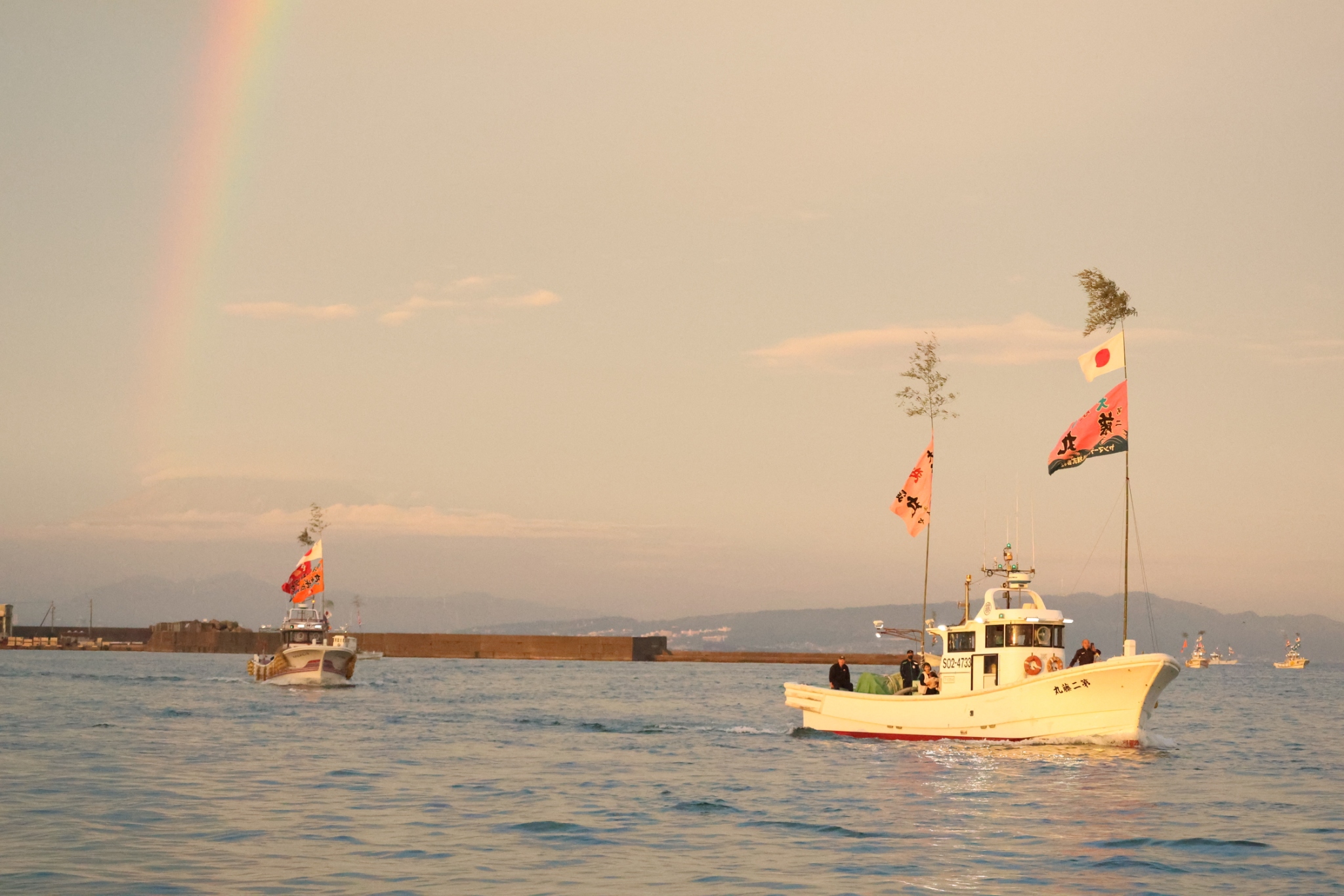漁船パレートと虹のコラボという神々しい光景も..。