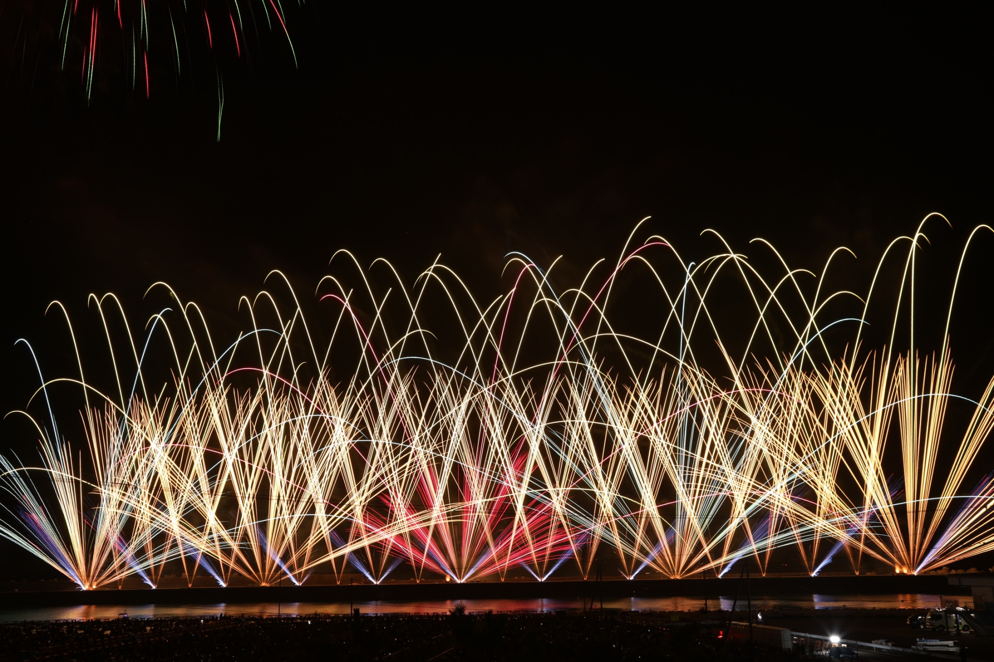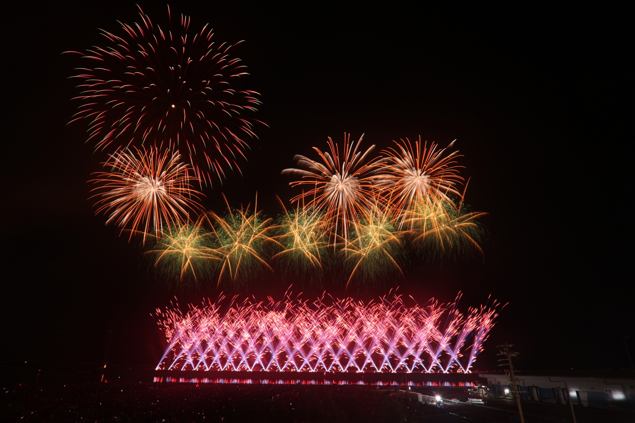 例年よりも長い、1時間30分にわたり、豪華な花火が次々打ち上げられました。海上から打ち上がる光が水面に反射し、波が揺れるたびに色が変わる。