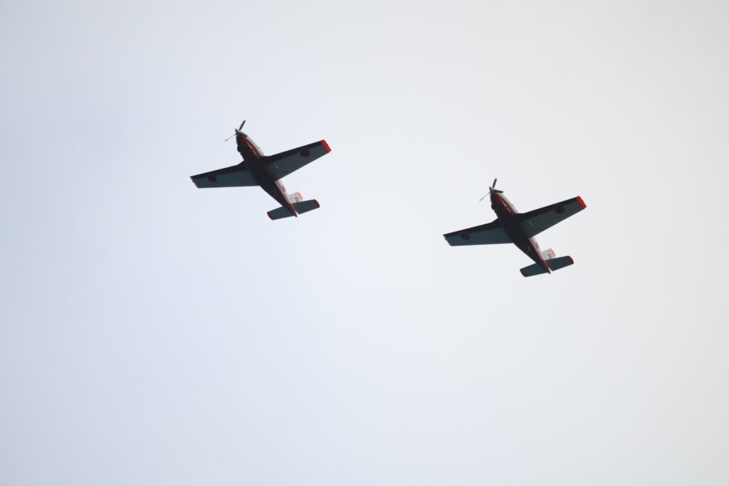 花火大会会場の焼津漁港新港の上空を航空自衛隊静波基地所属の航空機T-7が力強く旋回。