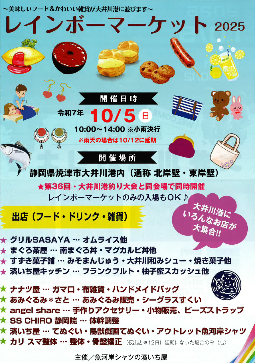開催期間 | 10月5日(日)9:00~14:00 (レインボーマーケットは10:00~14:00) ※予備日10月12日(日) ※釣り大会は要事前申し込み |