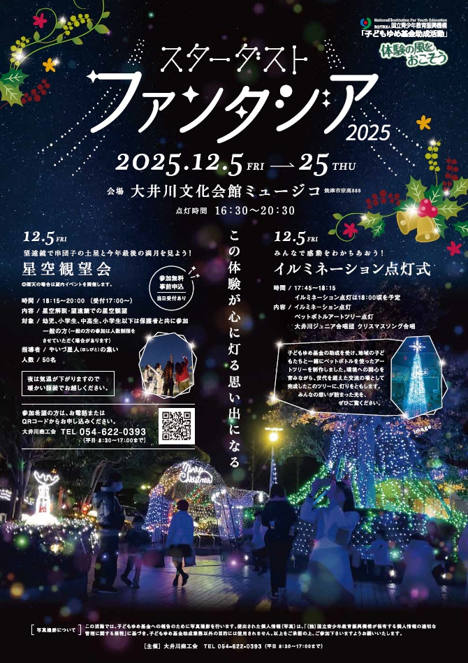 | 開催期間 | 2025年11月19日(水)~2026年1月31日(土) 点灯時間:17:00~22:00 ※イルミネーション点灯式実施日:11月19日(水)17:30~18:00 JR焼津駅南口駅前広場(駅前足湯横) |